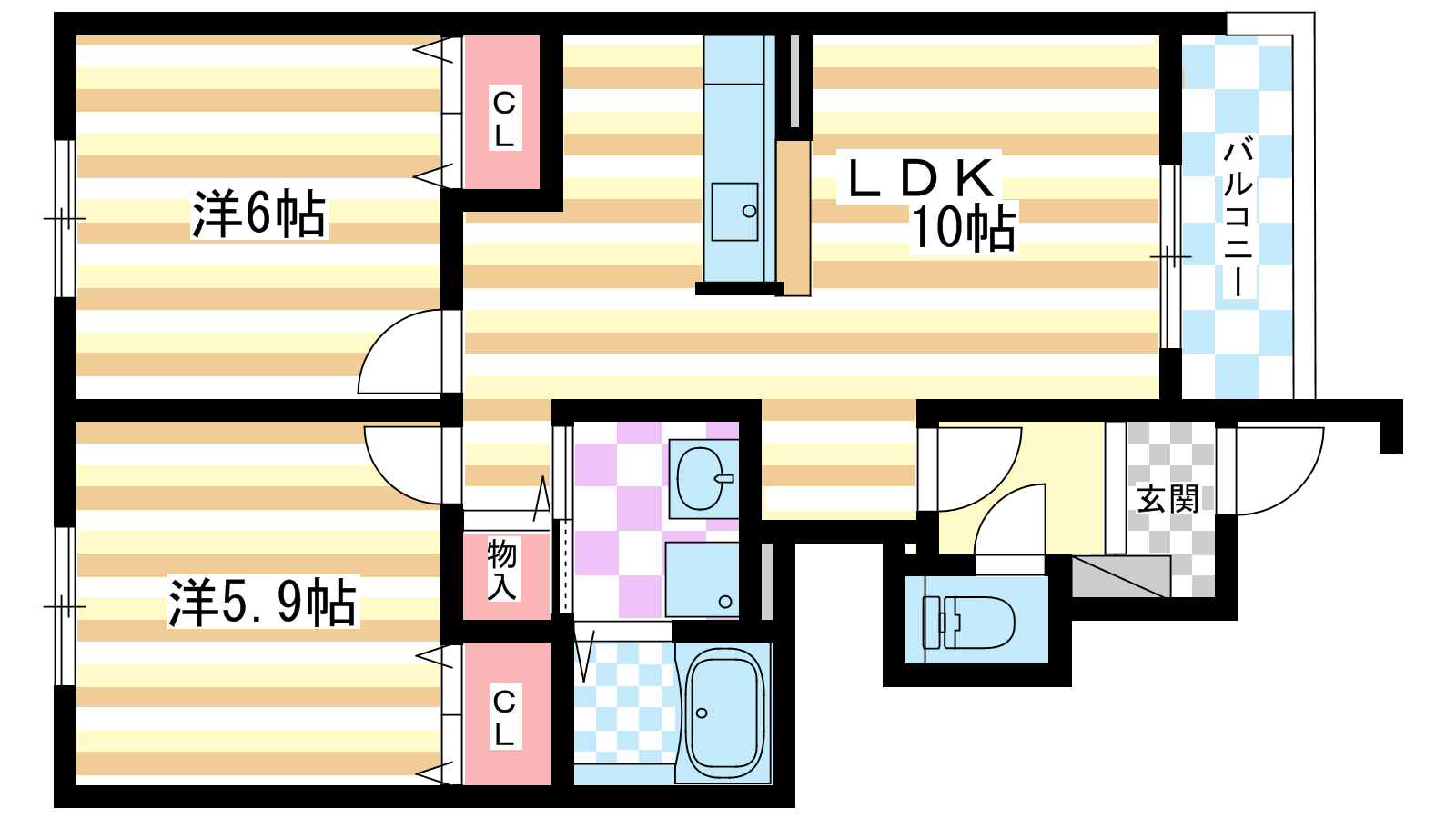 - 洋室5.9帖、洋室5.9帖、LDK10.5帖
