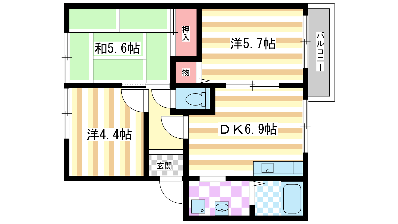 - 洋室5.7帖、洋室4.4帖、和室5.6帖、DK6.9帖
