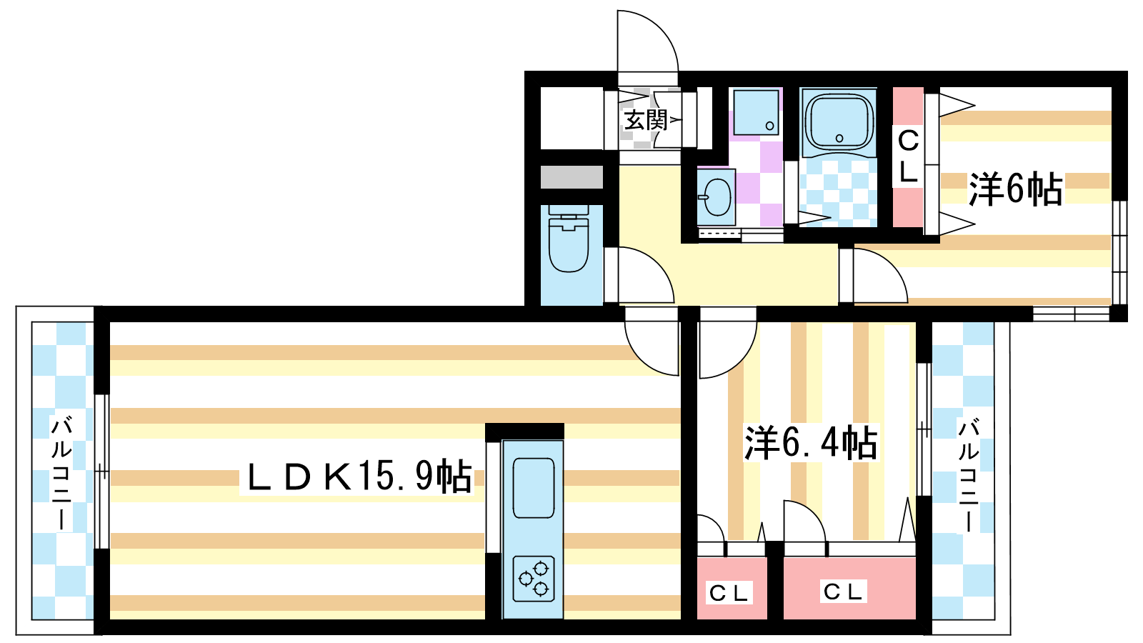 - LDK15.9帖、洋室6.4帖、洋室6帖
