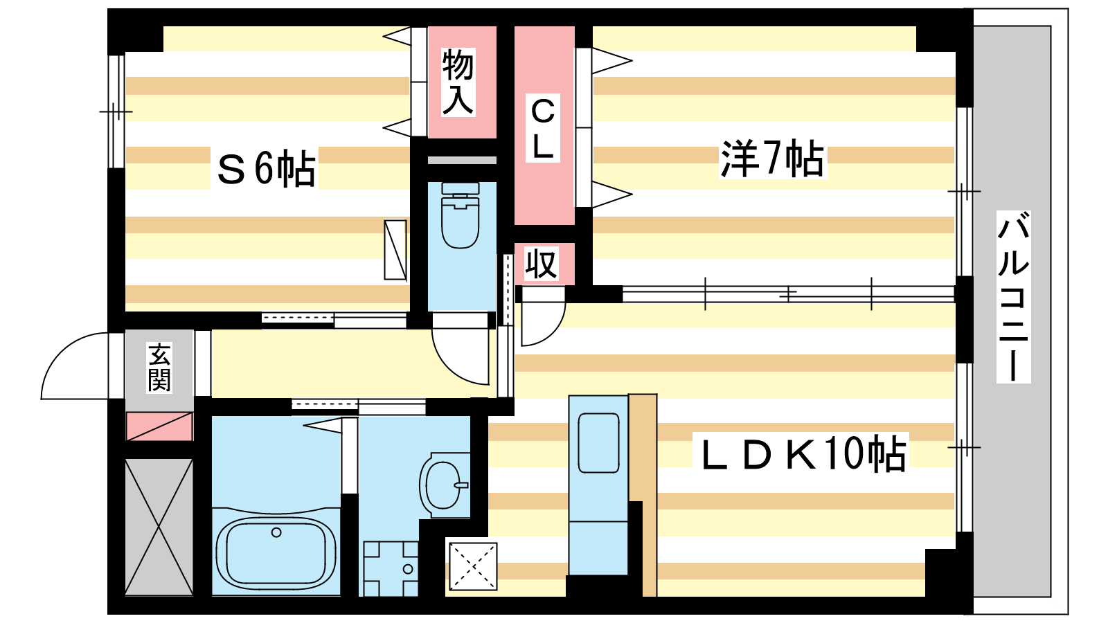 - LDK10帖、洋室7帖、S6帖