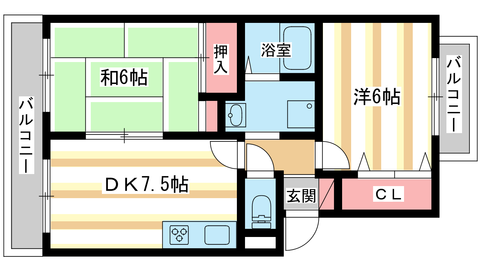 - 洋室6帖、和室6帖、DK7.5帖