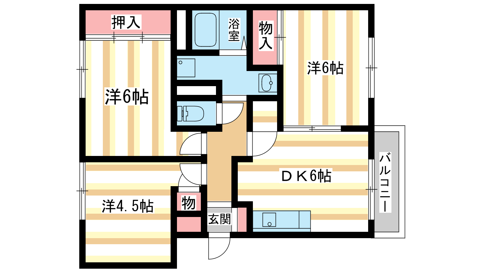 - 洋室4.5帖、洋室6帖、和室6帖、DK6帖
