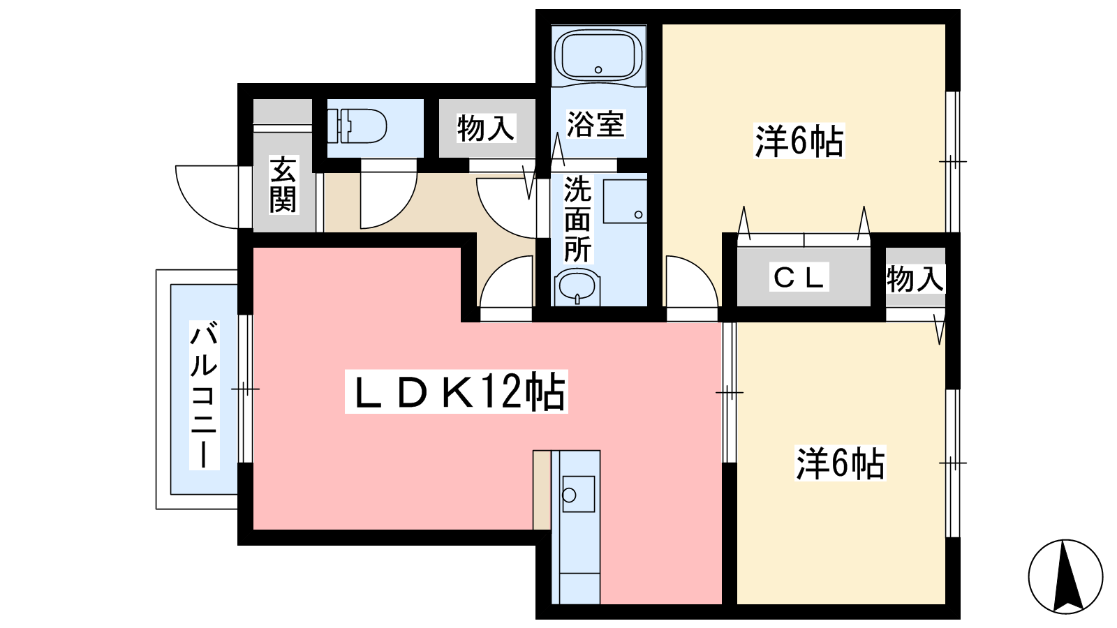 - 洋室6帖、洋室6帖、LDK12帖