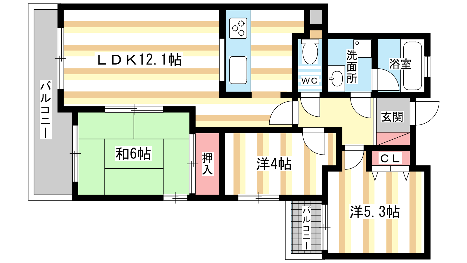 - LDK12.1帖、洋室5.3帖、洋室4帖、和室6帖
