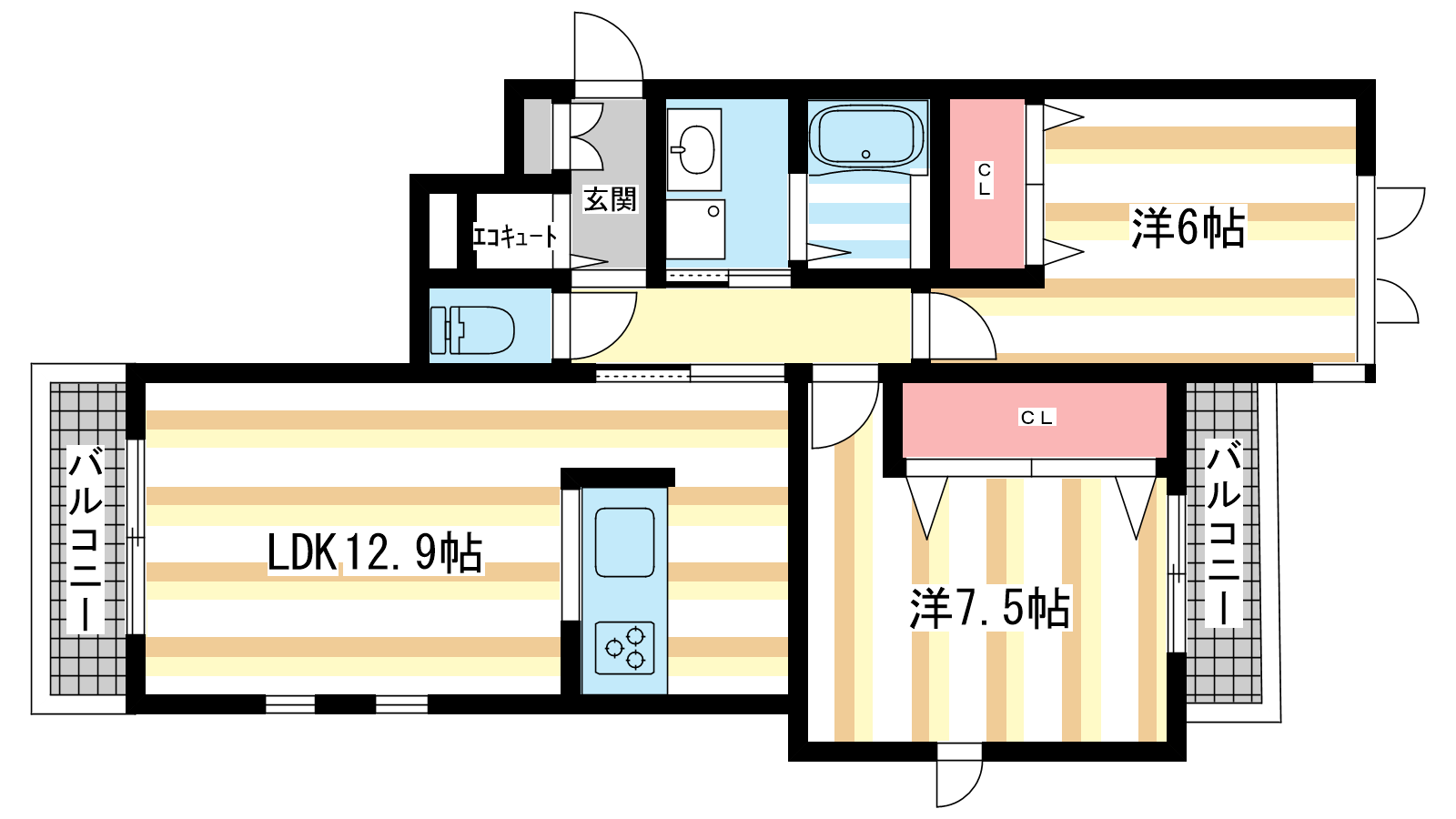 - LDK12.9帖、洋室7.5帖、洋室6帖