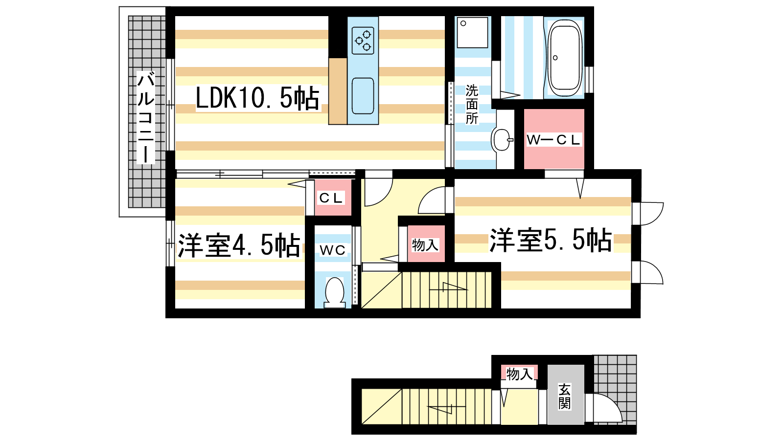 - 洋室5.5帖、洋室4.5帖、LDK10.5帖