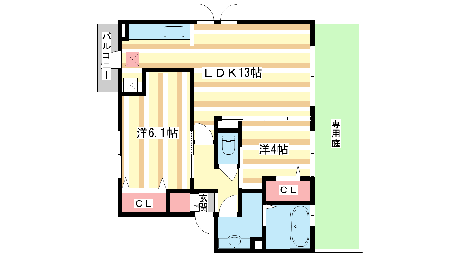 - 洋室4帖、洋室6.1帖、LDK13帖