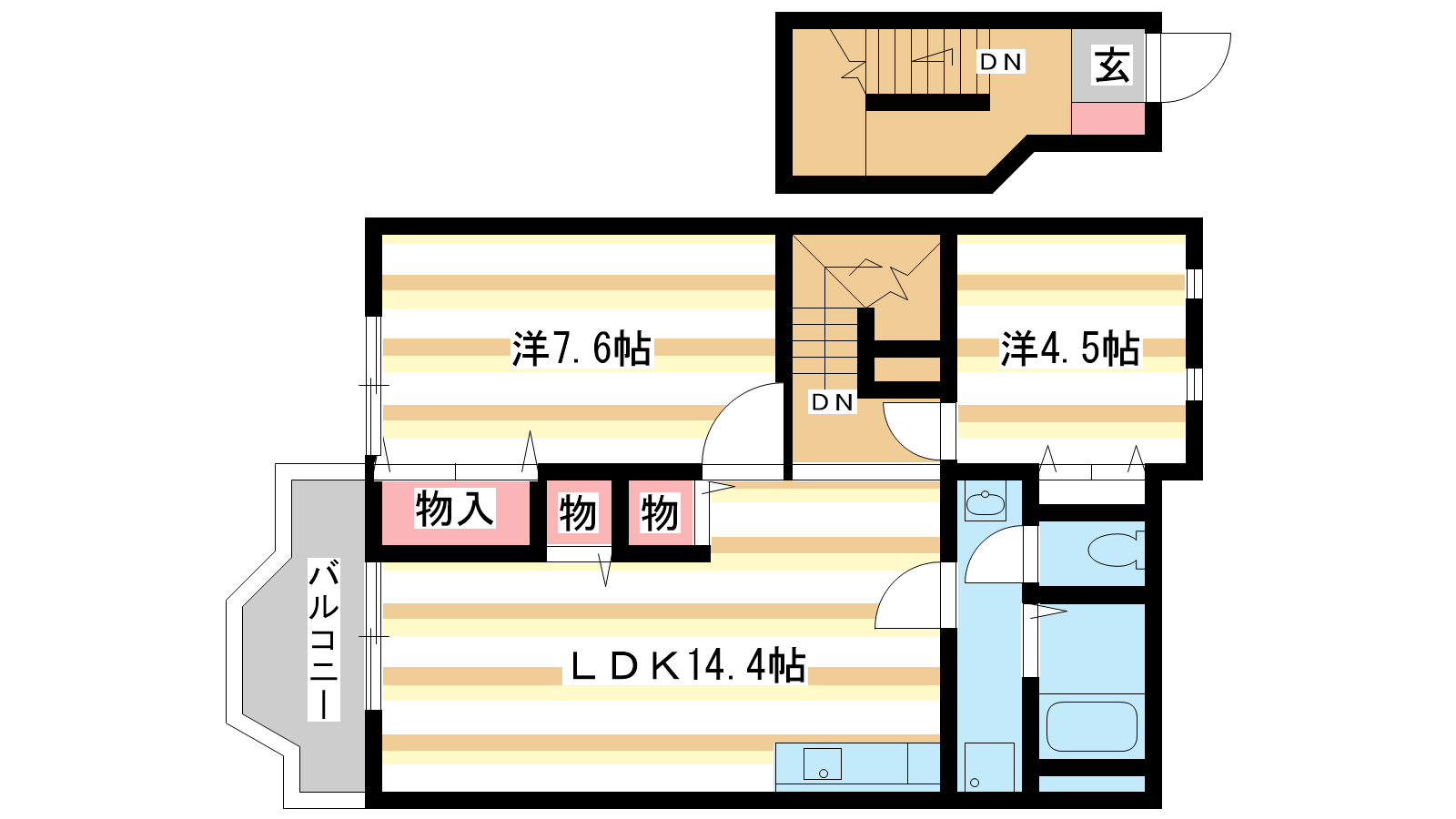 - 洋室7.6帖、洋室4.5帖、LDK14.4帖
