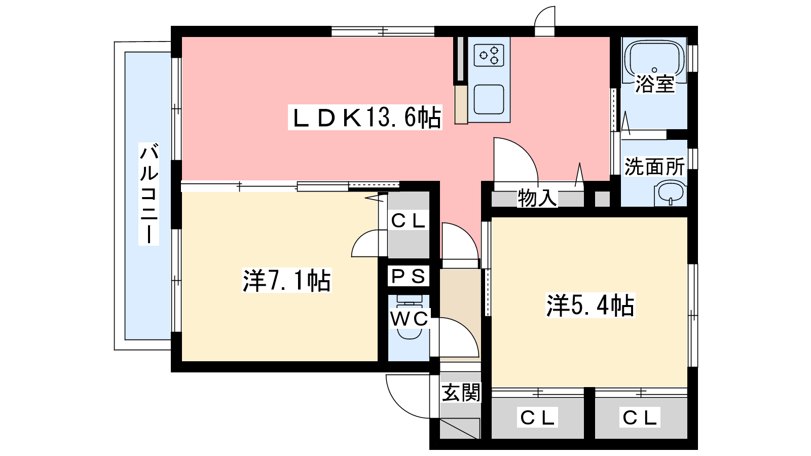 - LDK13.6帖、洋室7.1帖、洋室5.4帖