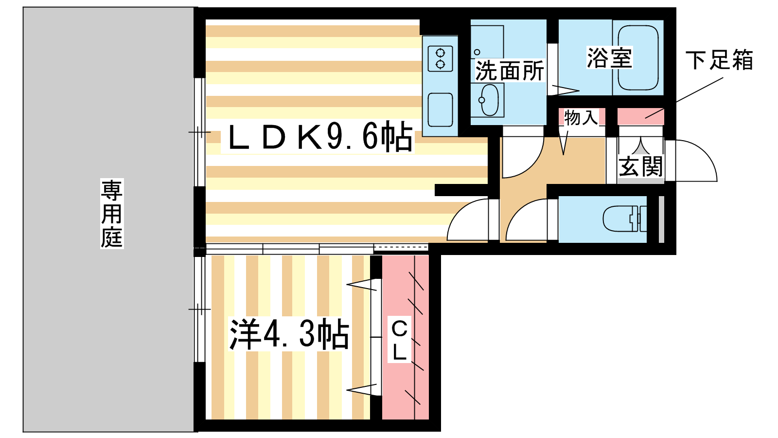 - 洋室4.3帖、LDK9.6帖