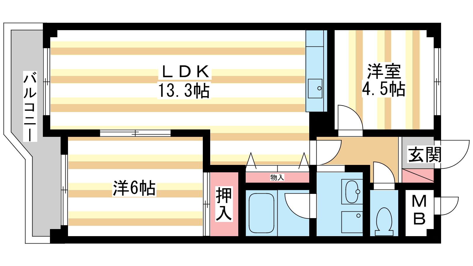 - 洋室6帖、洋室4.5帖、LDK13.3帖