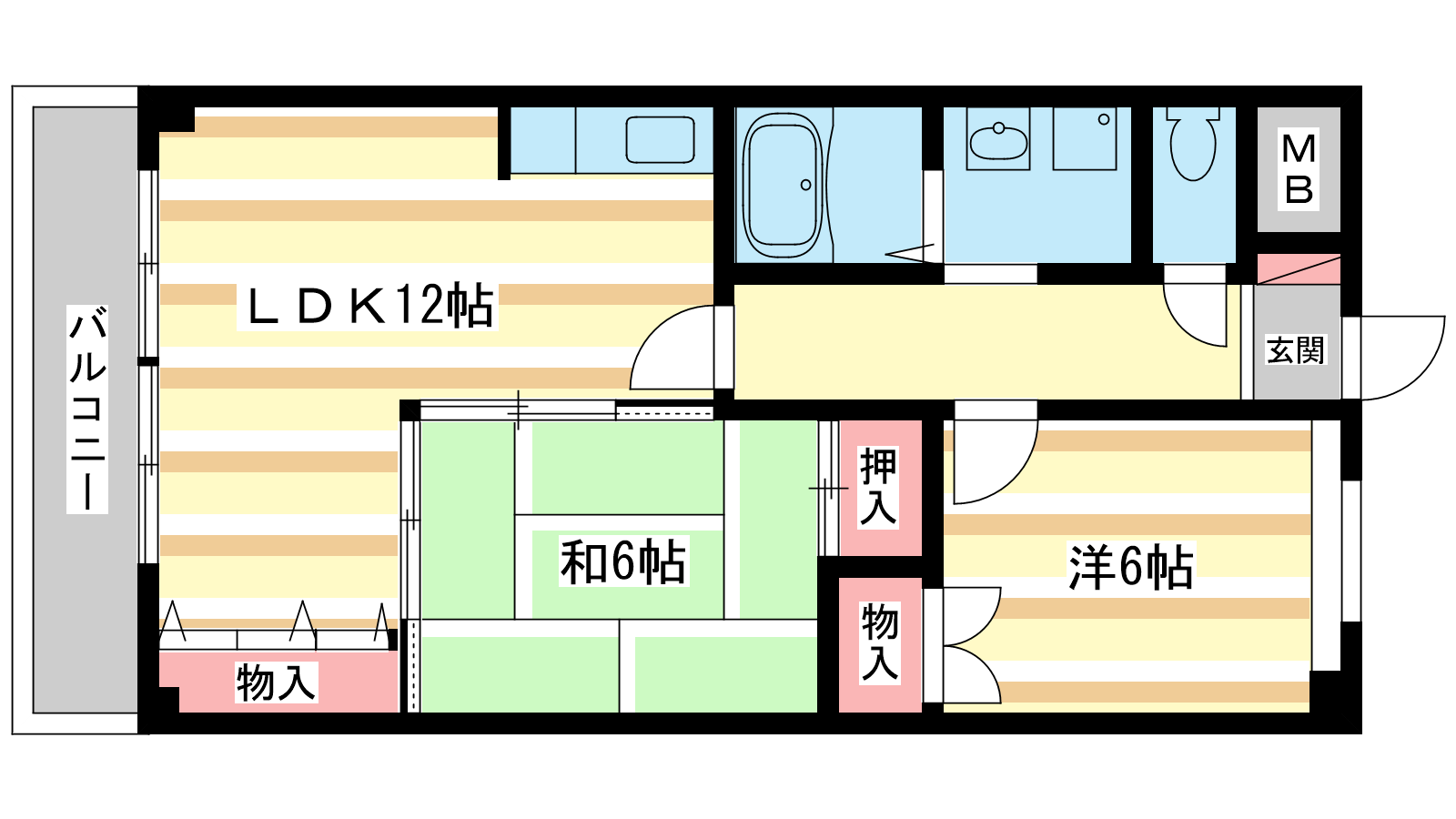 - 洋室6帖、和室6帖、LDK12帖