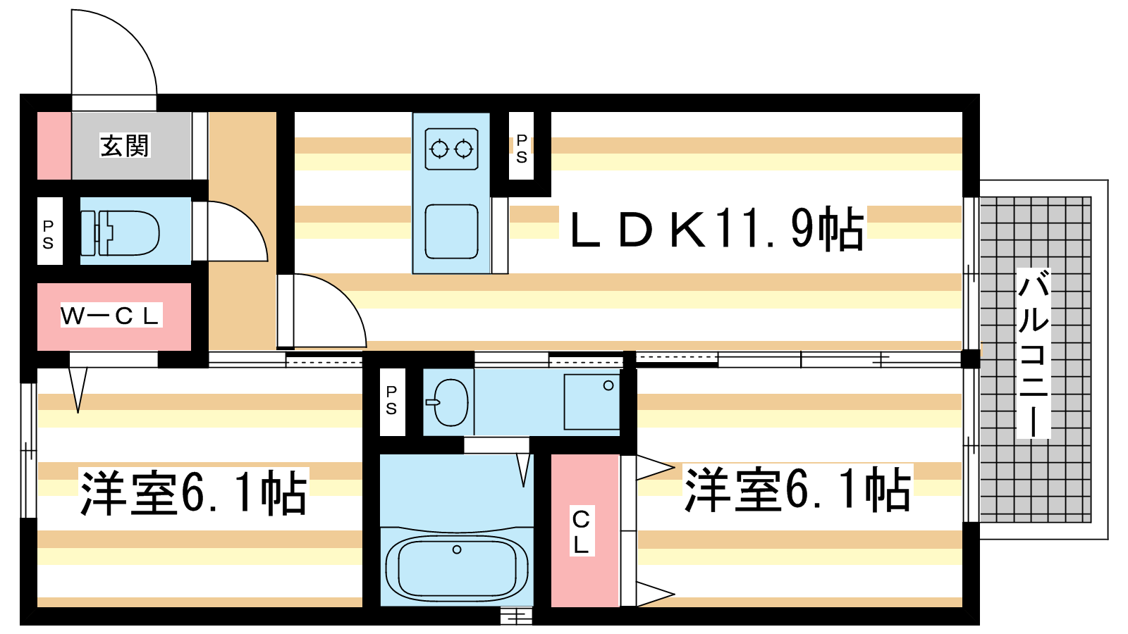 - LDK11.9帖、洋室6.1帖、洋室6.1帖