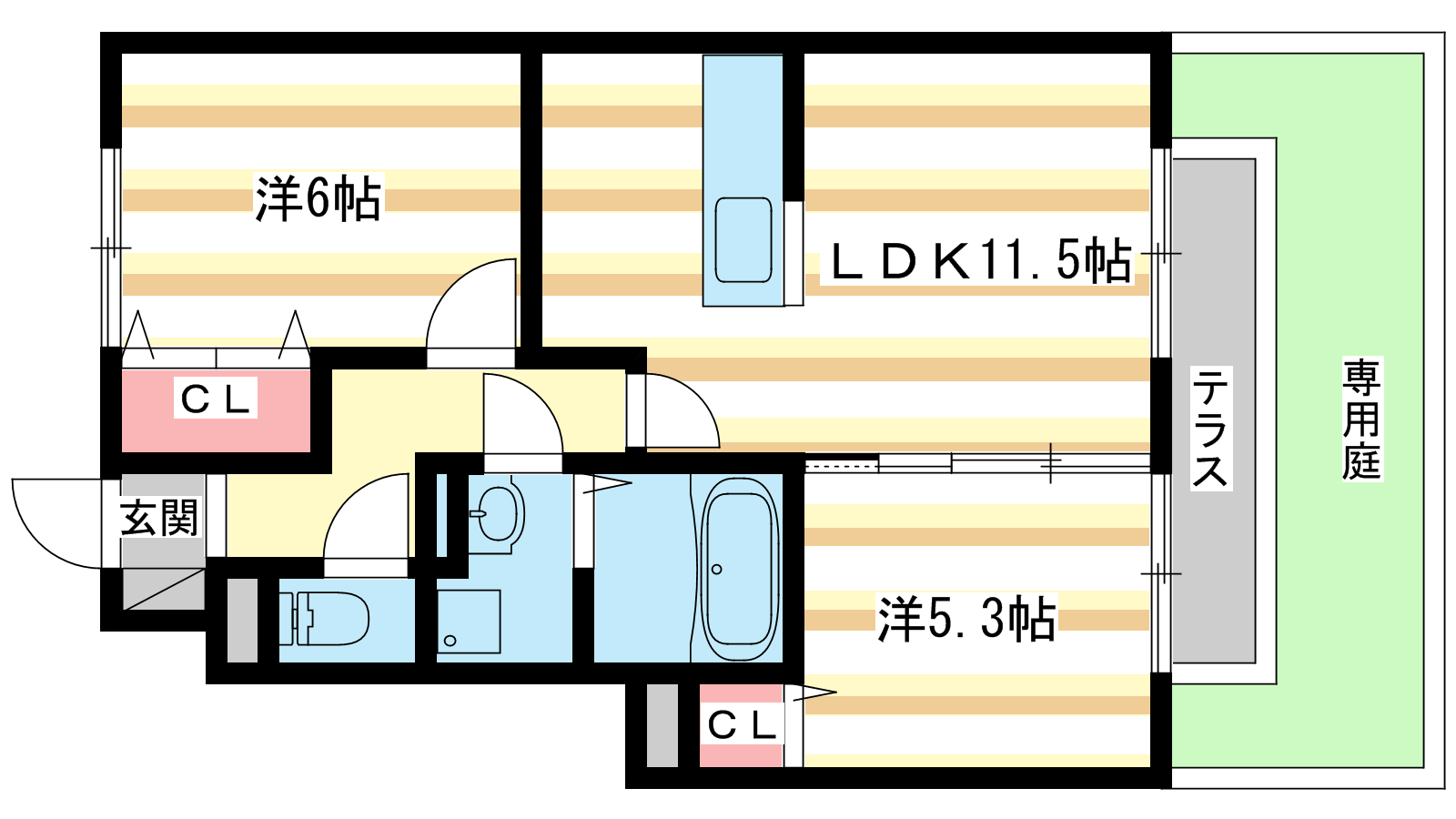 - 洋室6帖、洋室5.3帖、LDK11.5帖