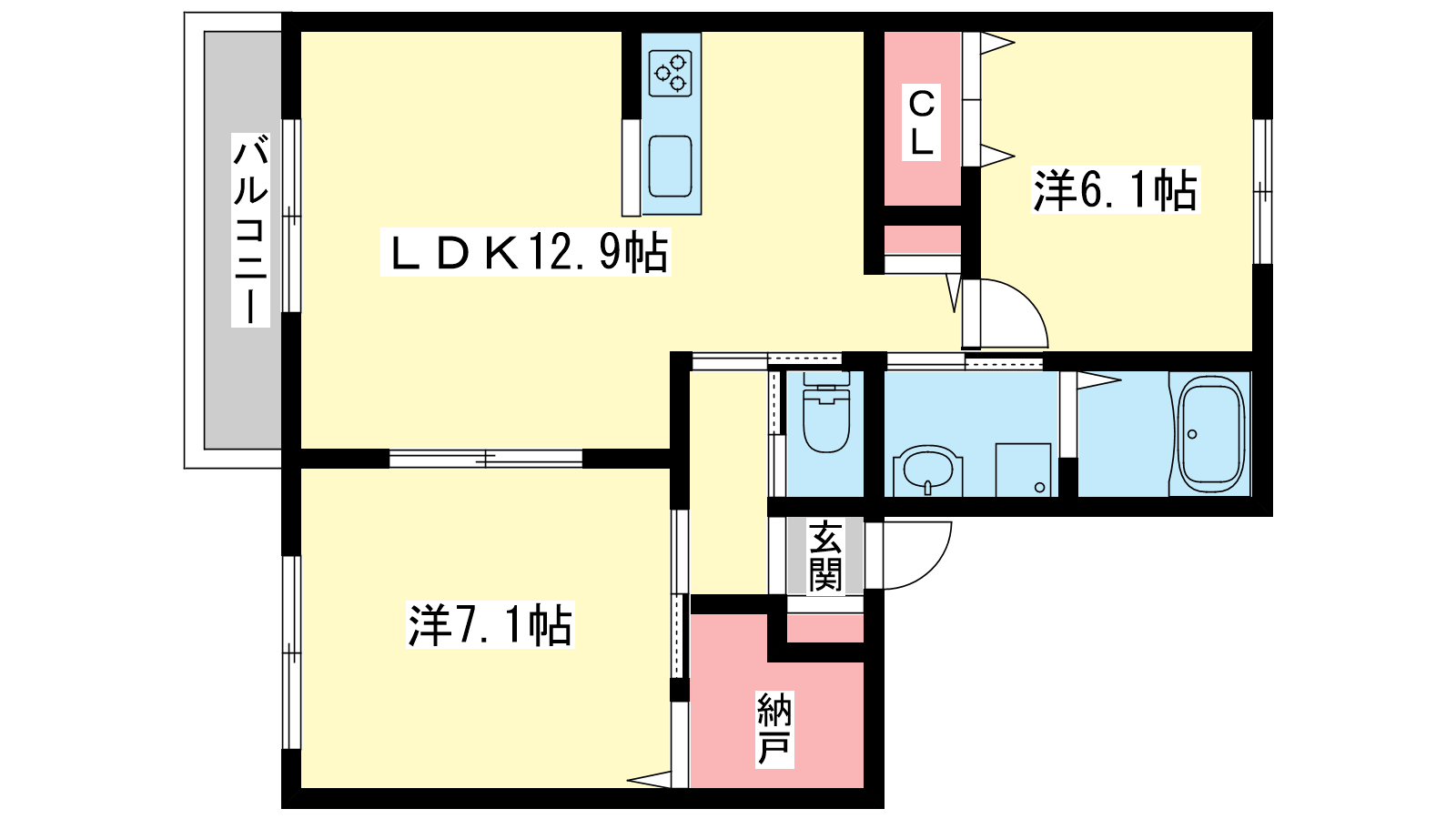 - 洋室6.1帖、LDK12.9帖、洋室7.1帖