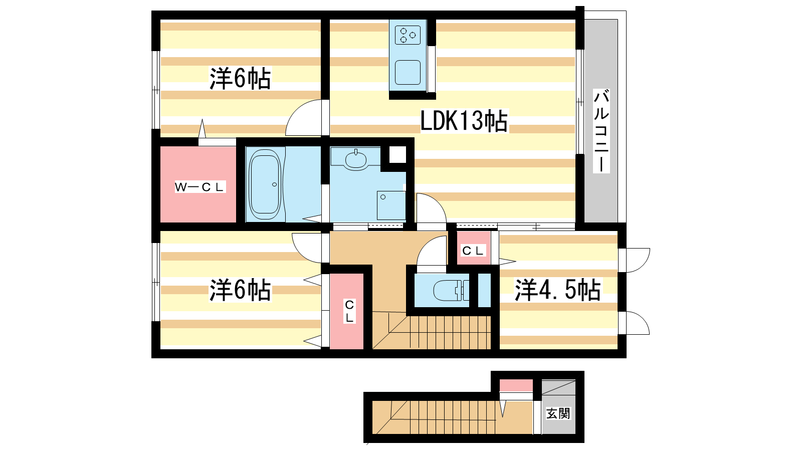 - LDK13帖、洋室6帖、洋室6帖、洋室4.5帖