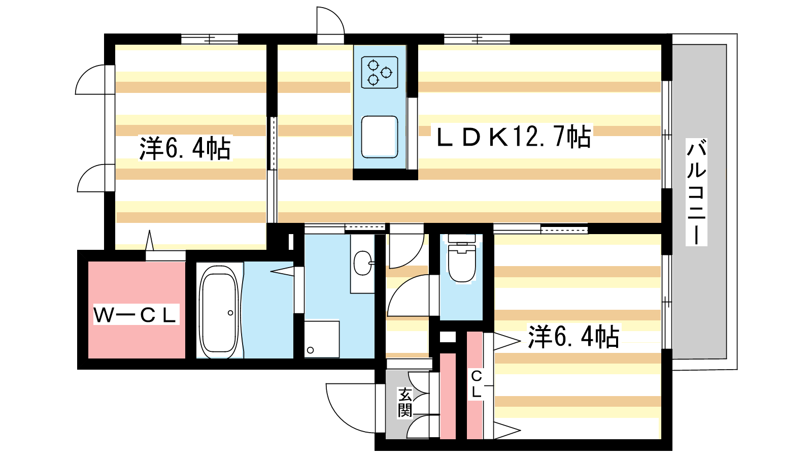 - LDK12.7帖、洋室6.4帖、洋室6.4帖