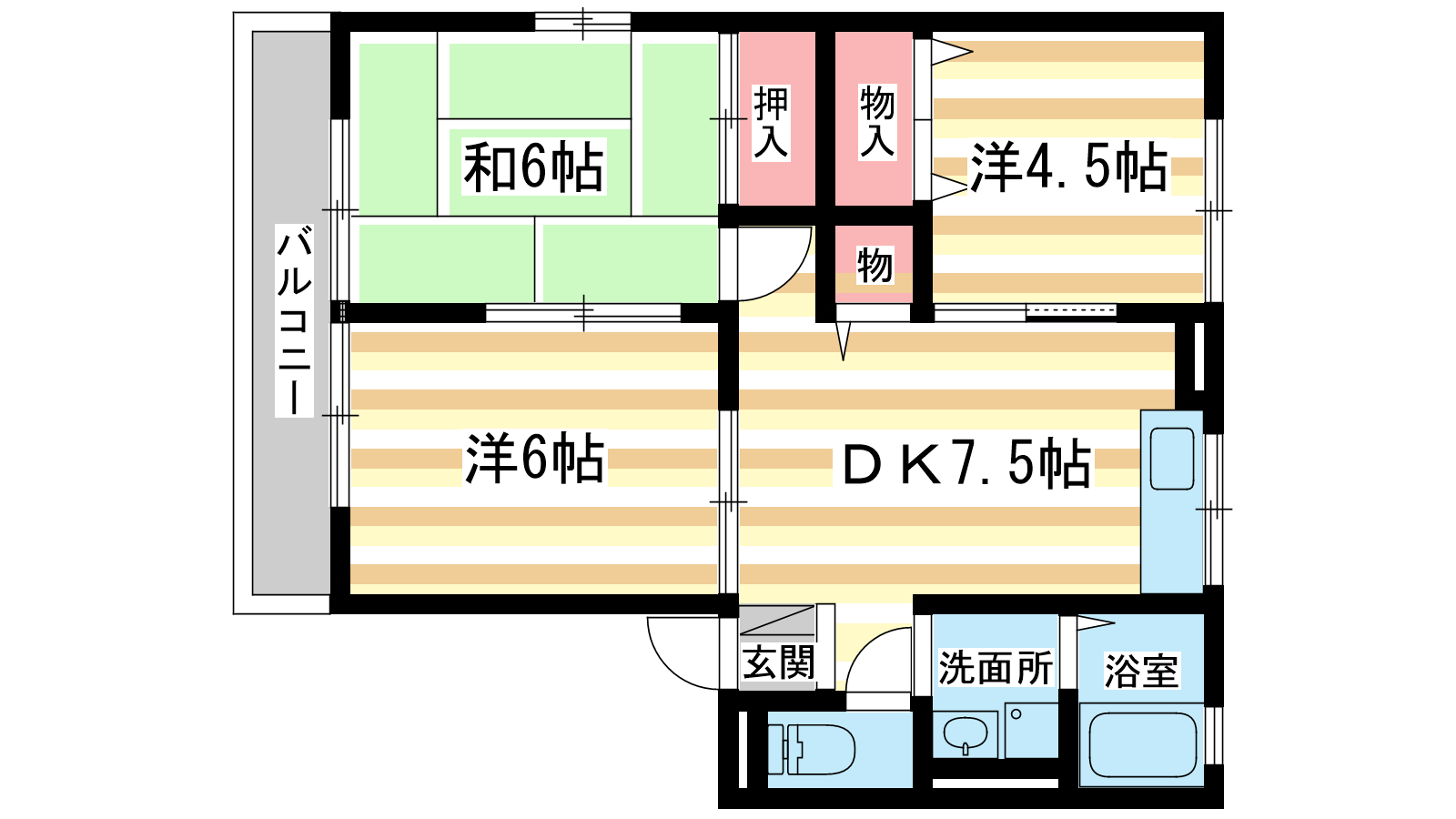 - DK7.5帖、和室6帖、洋室6帖、洋室4.5帖