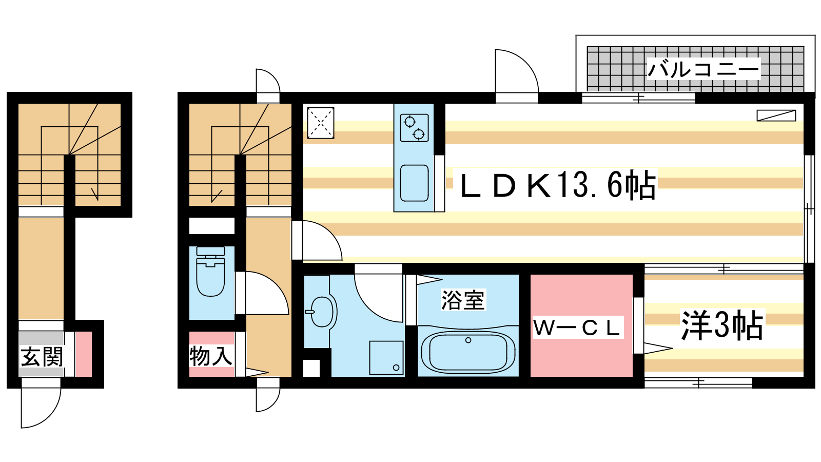 - LDK13.6帖、洋室3帖