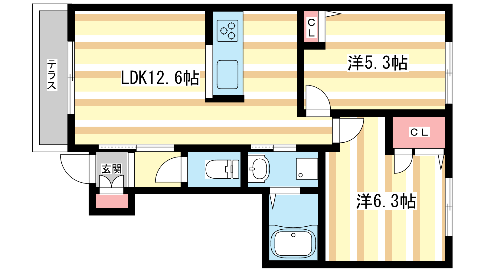 - LDK12.6帖、洋室6.3帖、洋室5.3帖