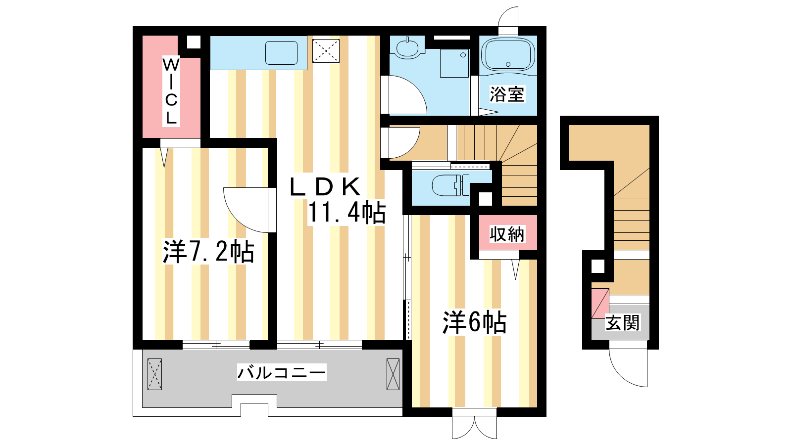- LDK11.4帖、洋室7.2帖、洋室6帖