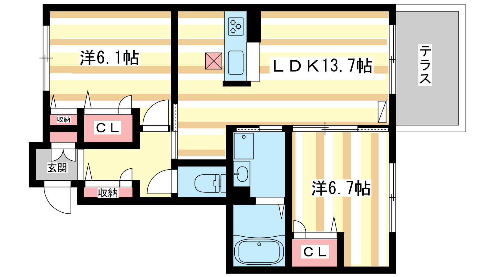 - LDK13.7帖、洋室6.7帖、洋室6.1帖
