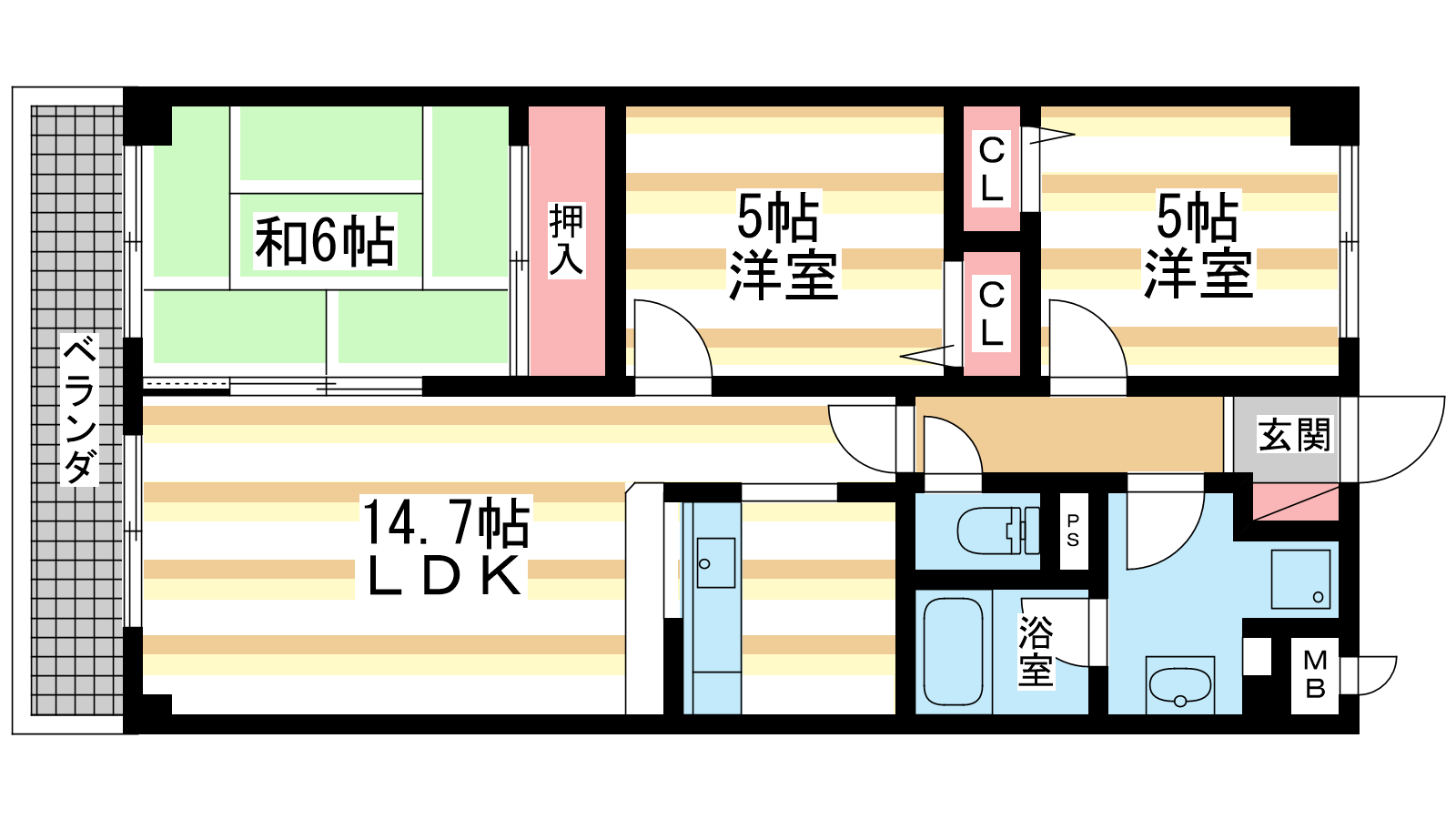 - 和室6帖、洋室5帖、洋室5帖、LDK14.7帖