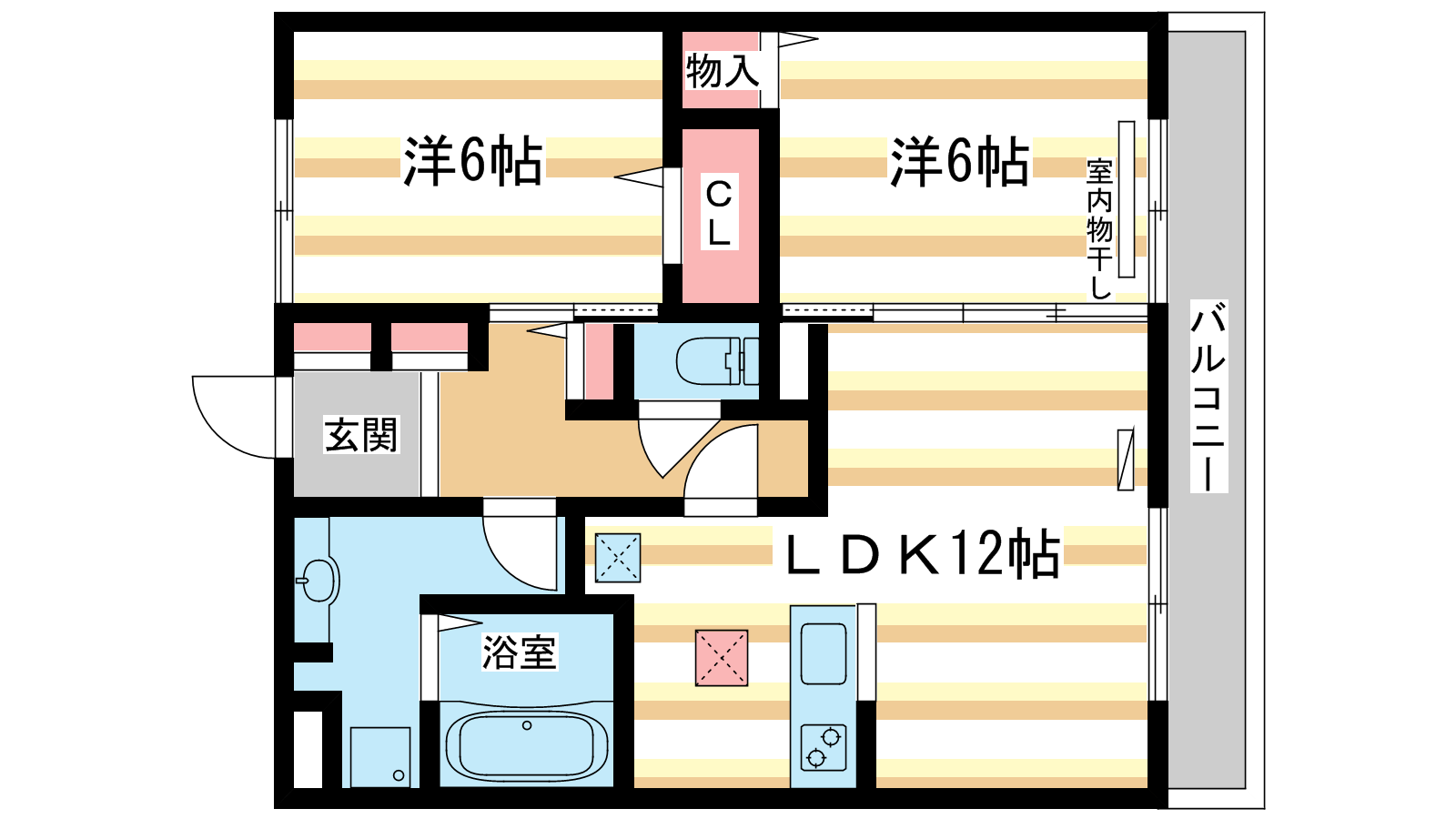 - LDK12帖、洋室6帖、洋室6帖
