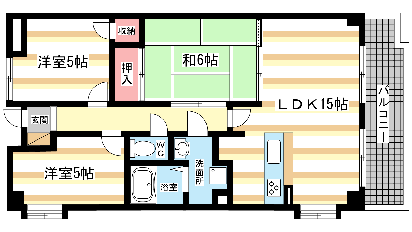 - LDK15帖、和室6帖、洋室5帖、洋室5帖