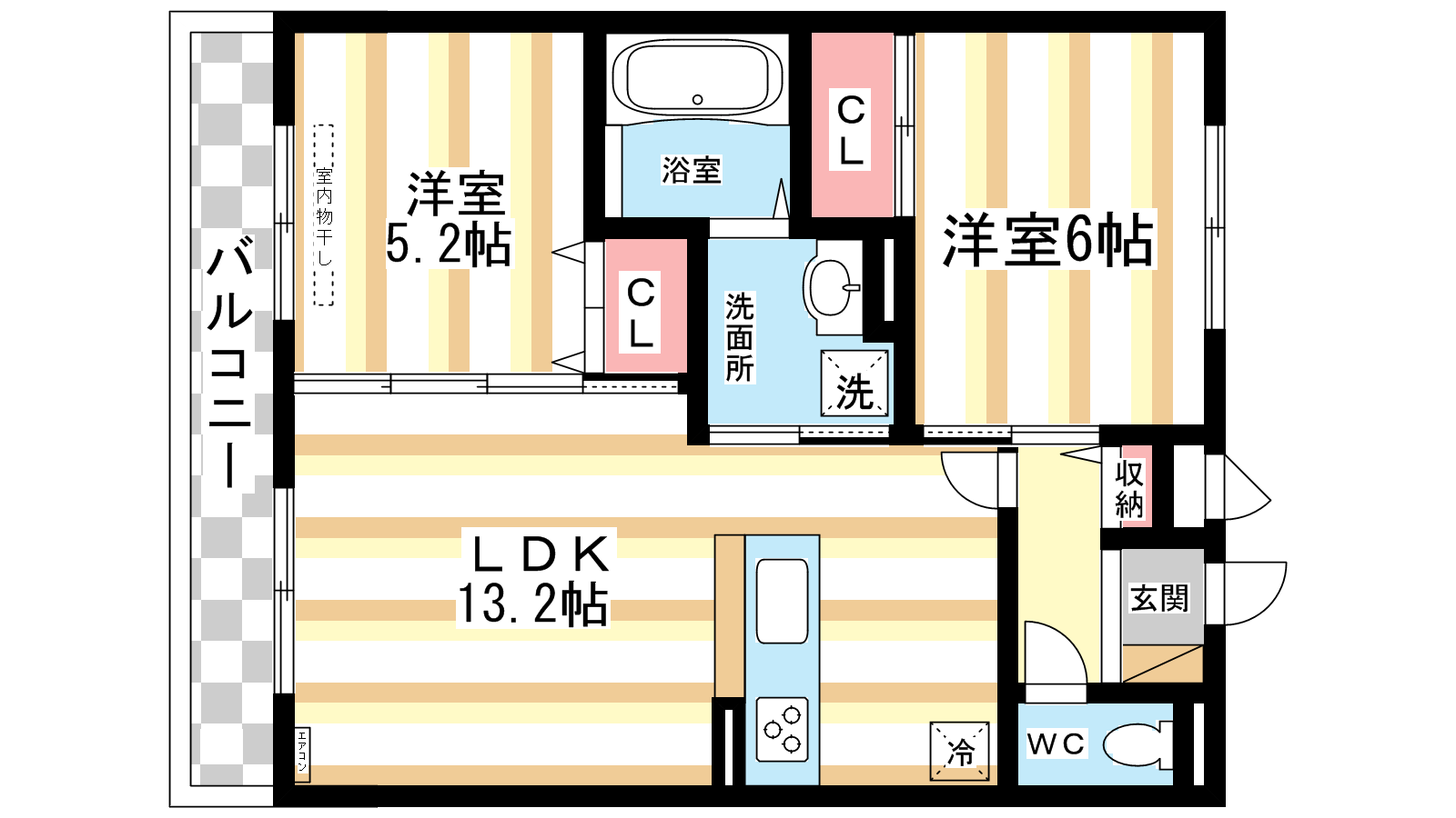 - 洋室6帖、洋室5.2帖、LDK13.2帖