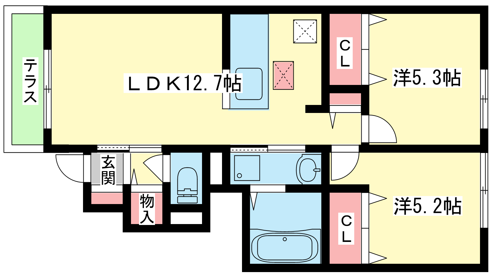 - LDK12.7帖、洋室5.3帖、洋室5.2帖