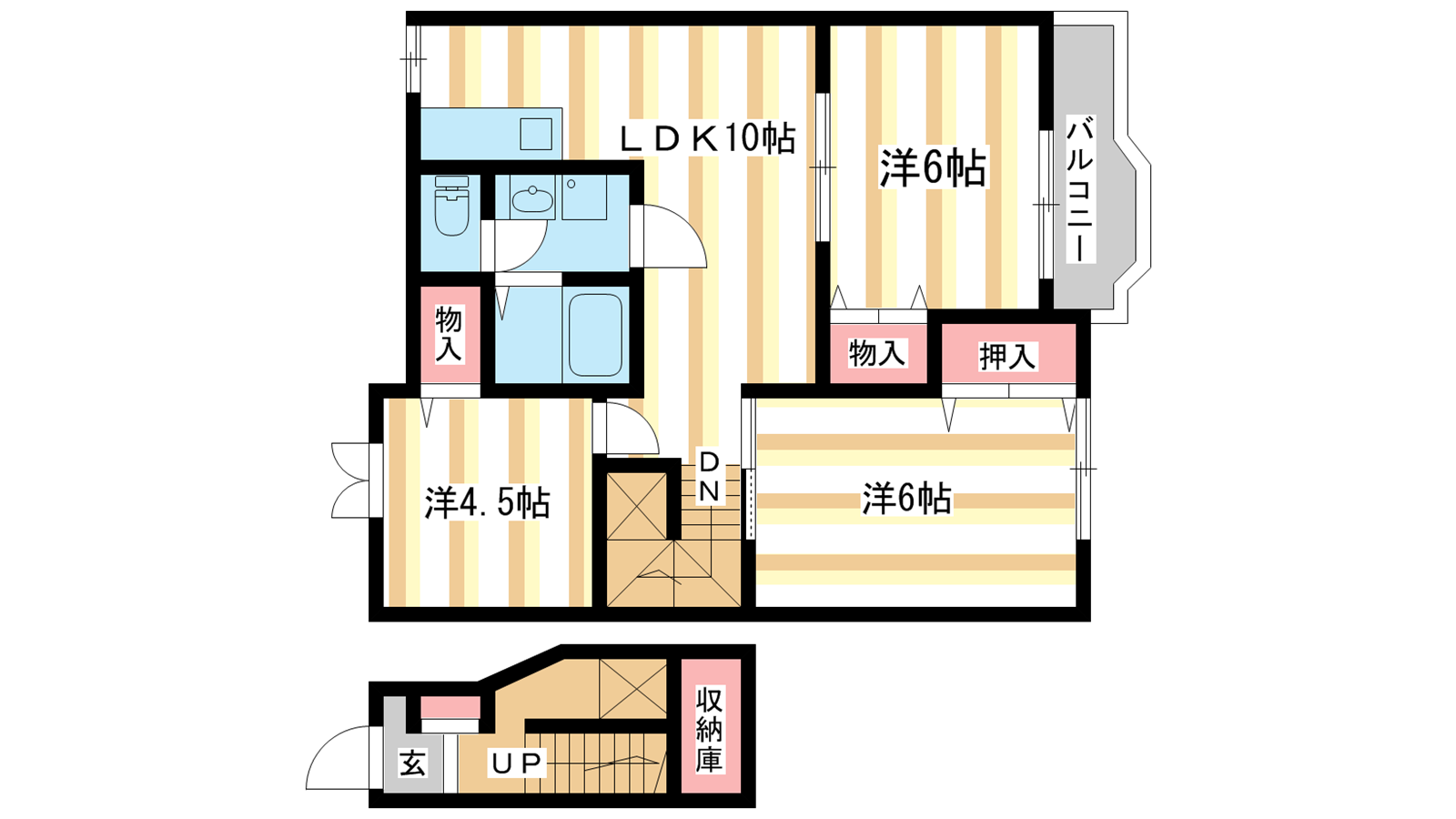 - 洋室6帖、洋室4.5帖、和室6帖、LDK9帖