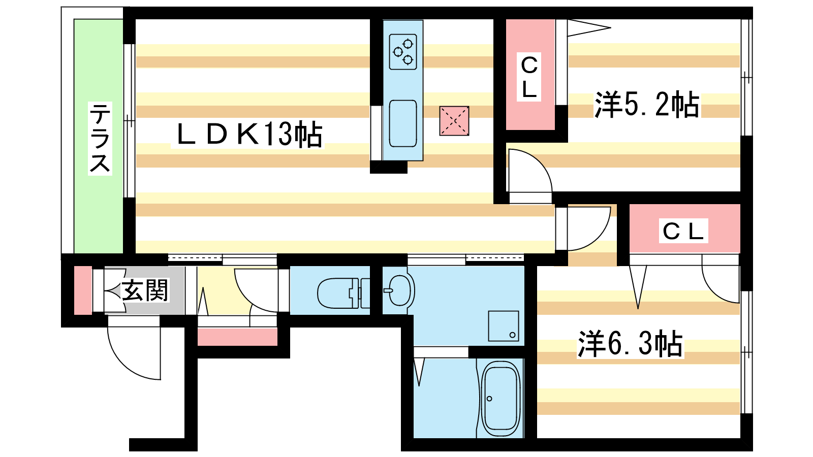 - LDK13帖、洋室6.3帖、洋室5.2帖