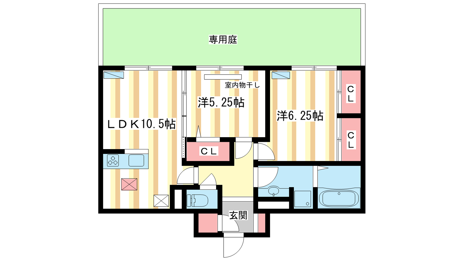 - LDK10.5帖、洋室6.25帖、洋室5.25帖