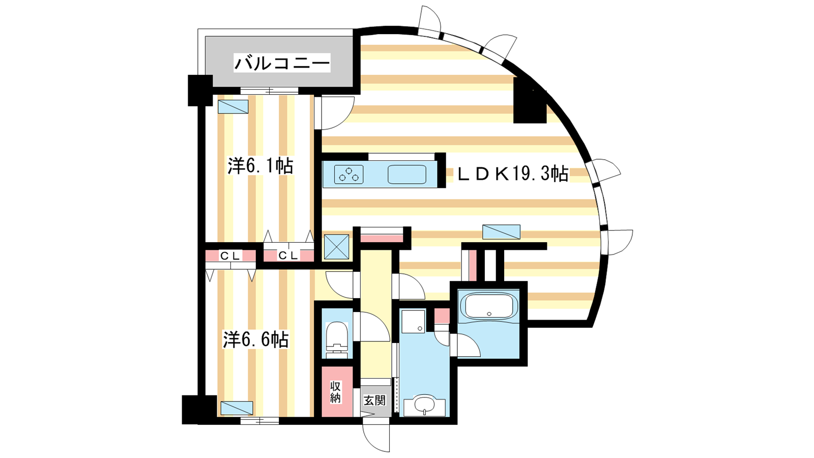 - LDK19.3帖、洋室6.6帖、洋室6.1帖