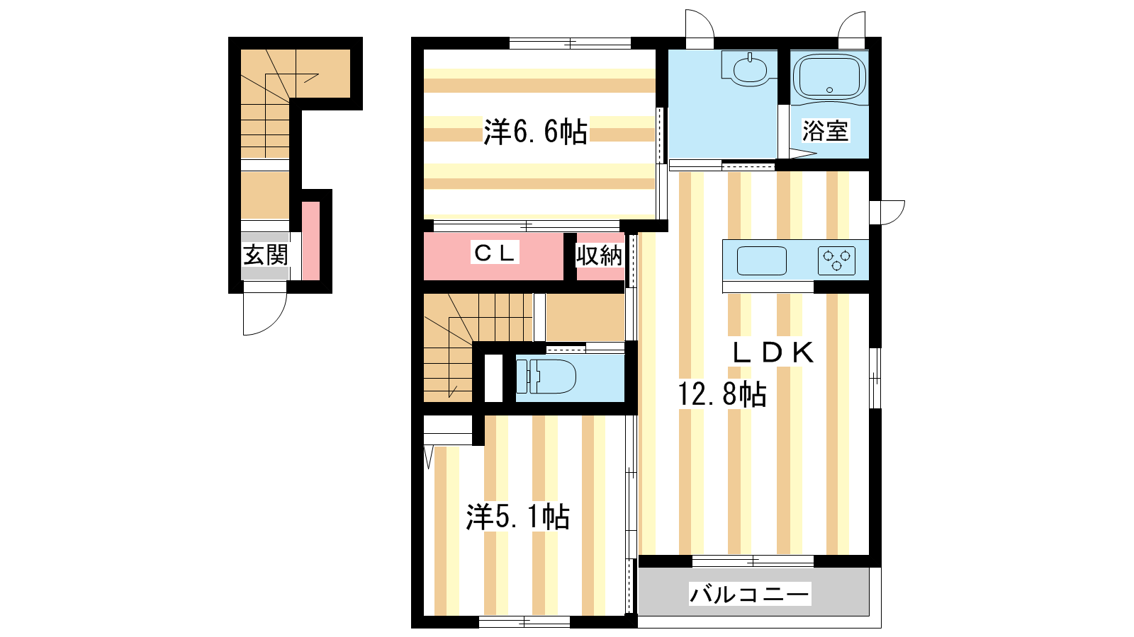 - LDK12.8帖、洋室6.6帖、洋室5.1帖