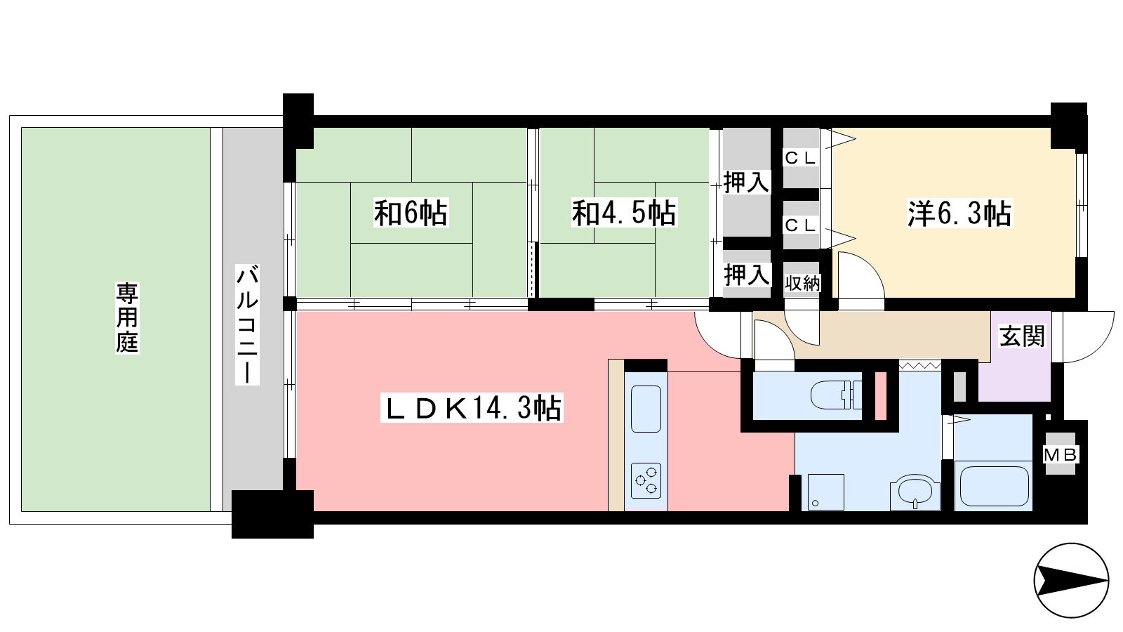 - LDK14.3帖、洋室6.3帖、和室6帖、和室4.5帖