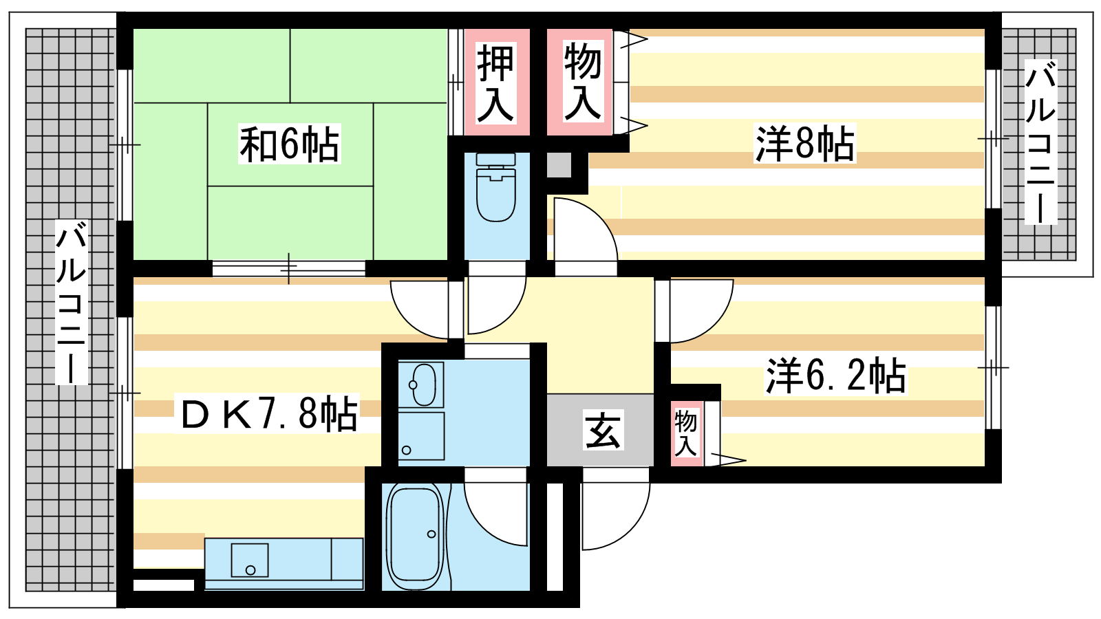 - 洋室8帖、洋室6.2帖、和室6帖、DK7.2帖