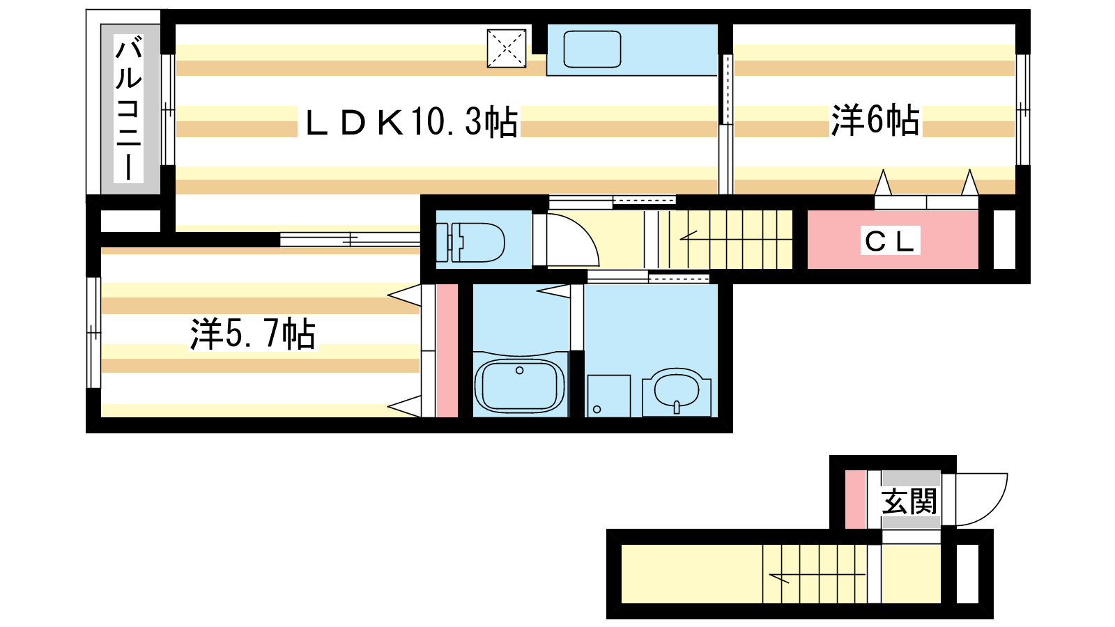 - LDK9.6帖、洋室5.7帖、洋室5.6帖