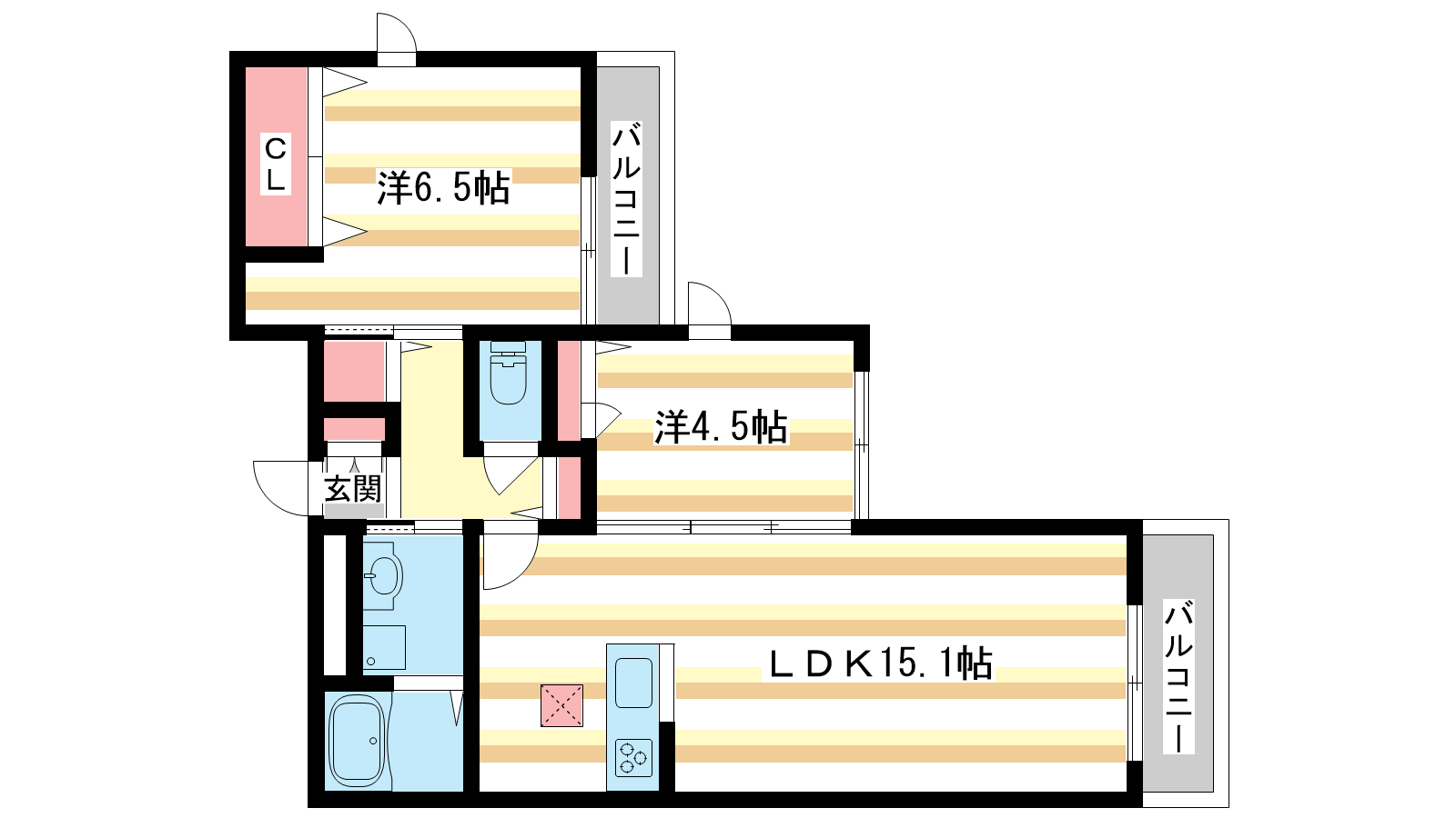 - LDK15.1帖、洋室6.5帖、洋室4.5帖