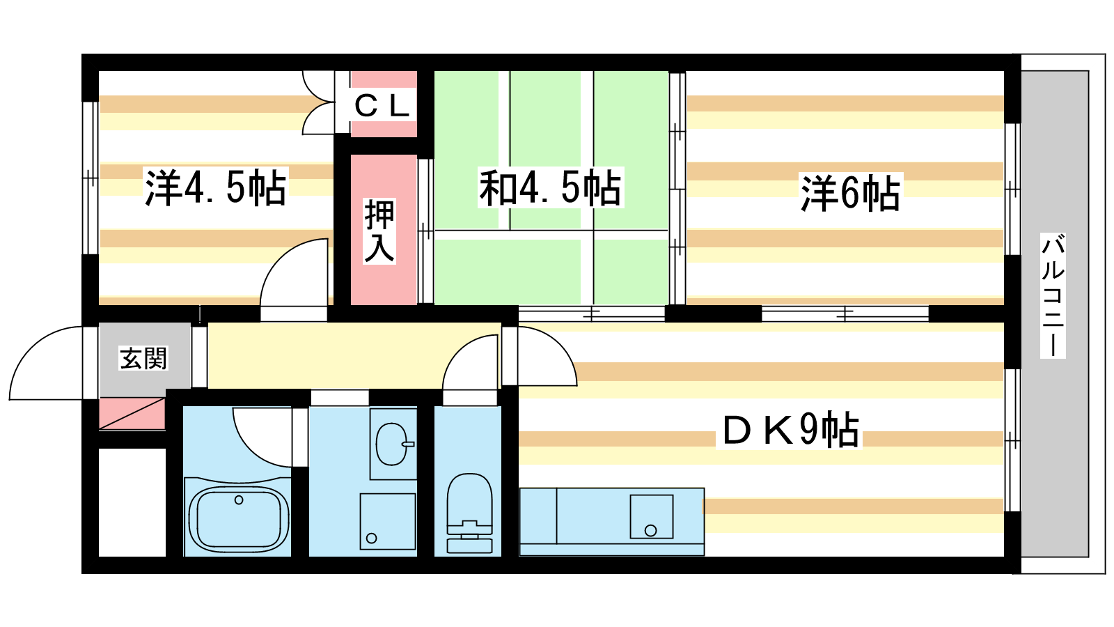 - LDK9帖、洋室4.5帖、和室4.5帖、洋室6帖