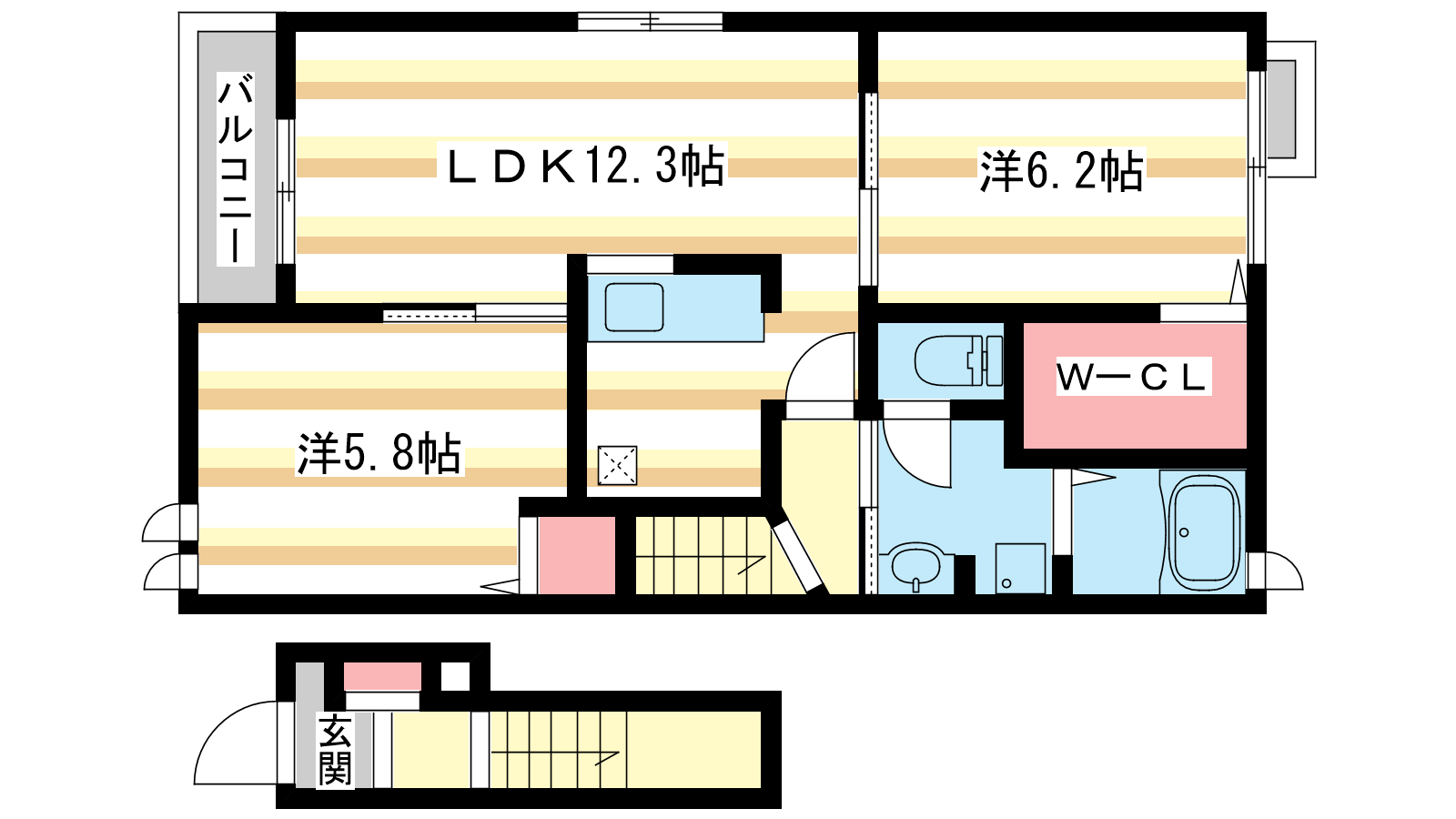 - LDK12.3帖、洋室6.2帖、洋室5.8帖