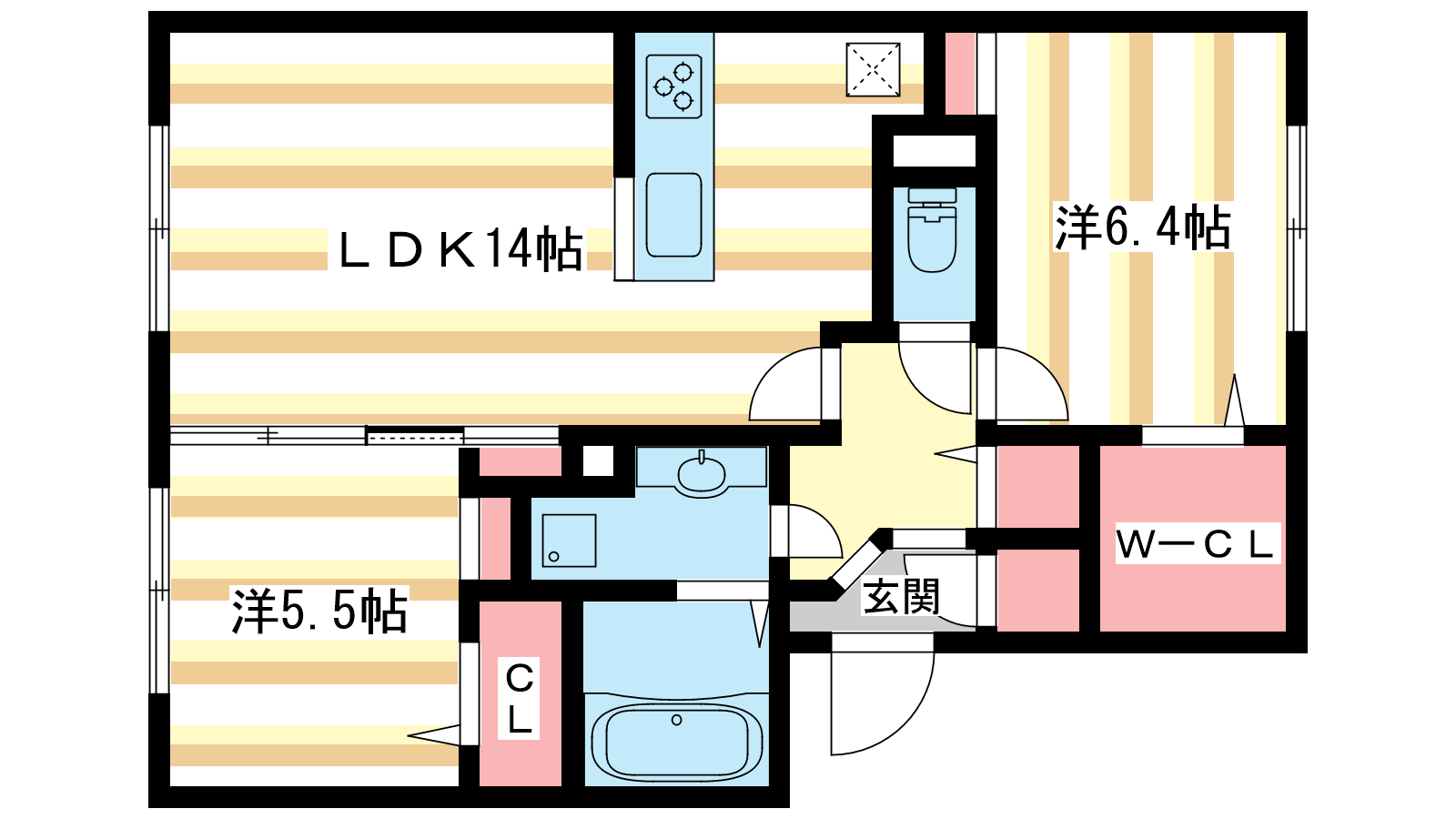 - LDK14帖、洋室6.4帖、洋室5.5帖