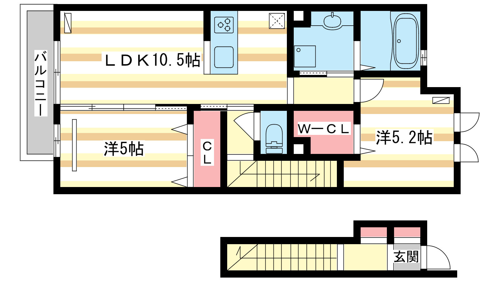 - LDK10.5帖、洋室5.2帖、洋室5帖
