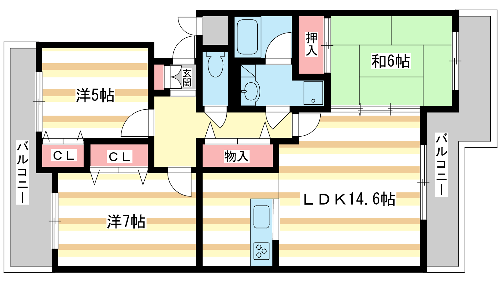 - 洋室7帖、洋室5帖、和室6帖、LDK14.6帖