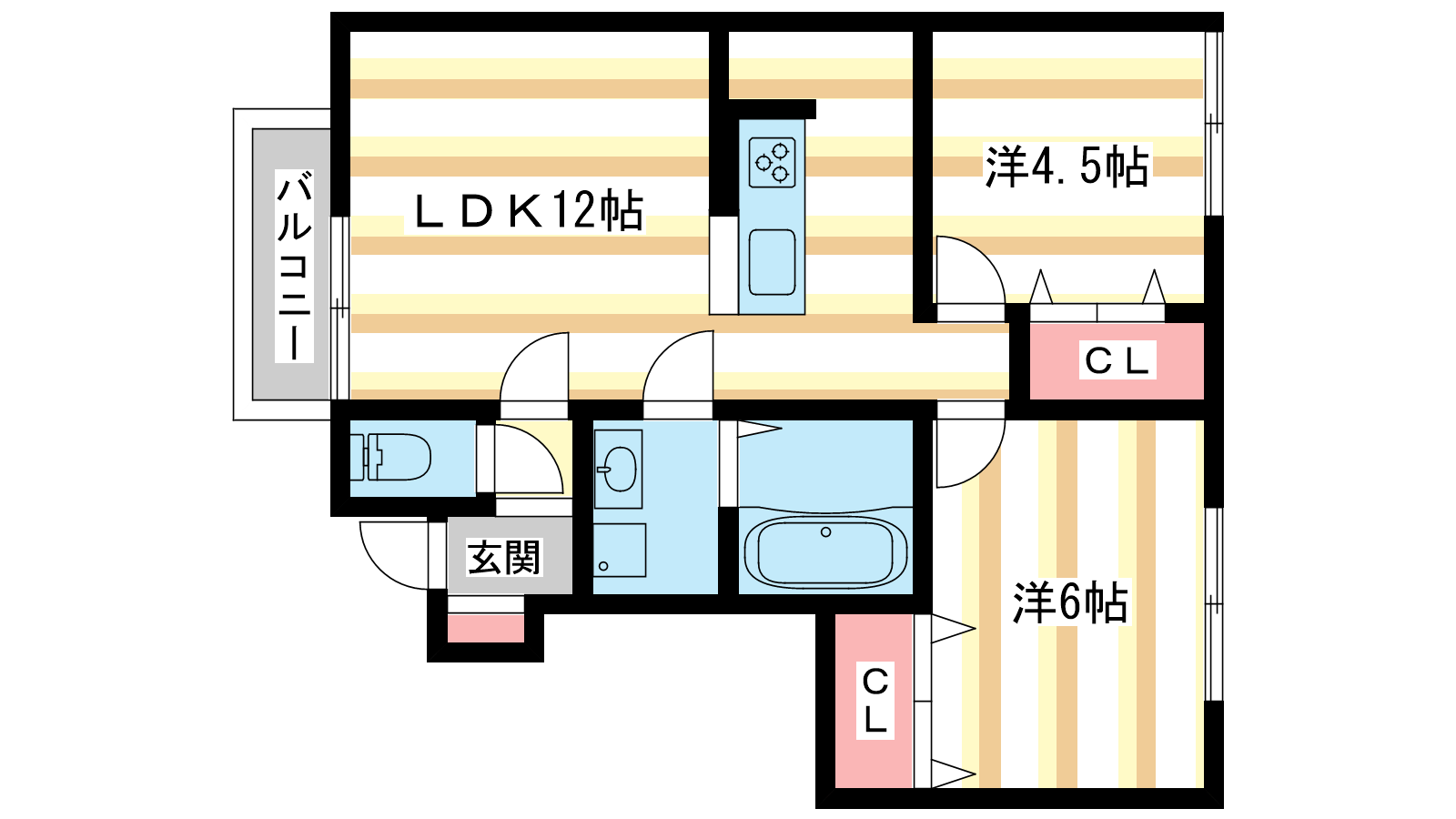 - LDK12帖、洋室6帖、洋室4.5帖