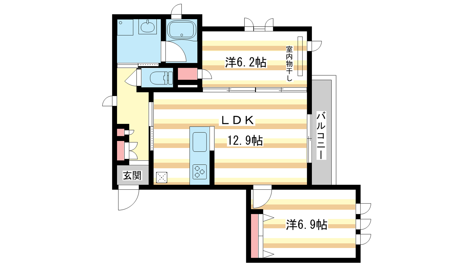 - LDK12.9帖、洋室6.9帖、洋室6.2帖