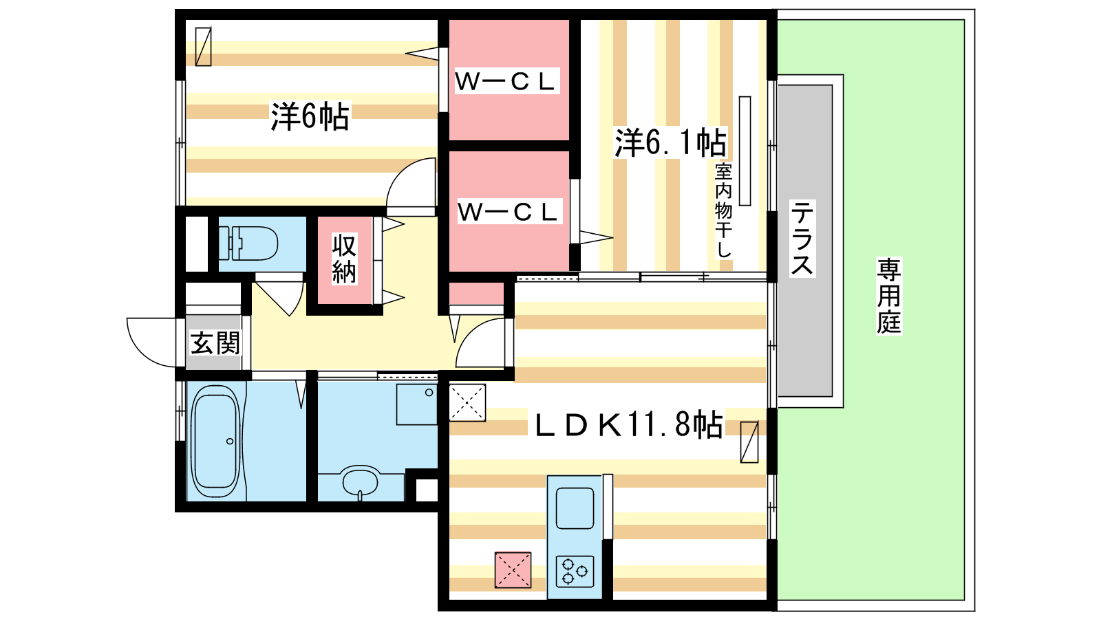 - LDK11.8帖、洋室6.1帖、洋室6帖