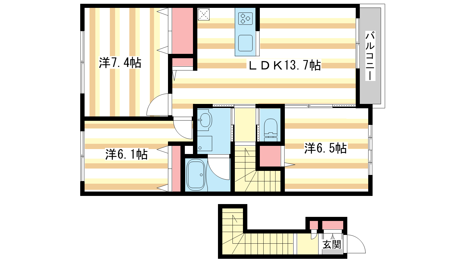 - LDK13.7帖、洋室7.4帖、洋室6.5帖、洋室6.1帖