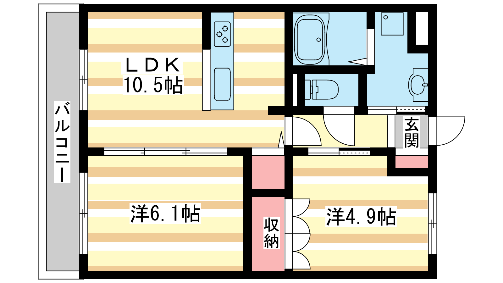 - 洋室4.9帖、洋室6.1帖、LDK10.5帖